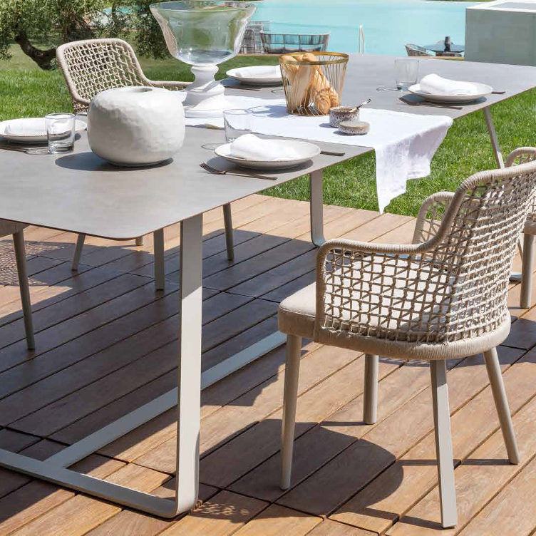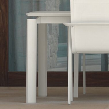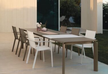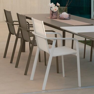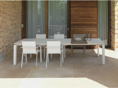 Completo Milo con tavolo allungabile 160/215 x 95 dal design unico per la leggerezza. Contraddistinto dalla struttura in una fusione di alluminio e piano in alluminio verniciato a polvere disponibile in tre diverse varianti di colore quale bianco, tortora o grafite. La seduta in abbinamento con seduta in textilene, richiama le linee morbide del tavolo, .