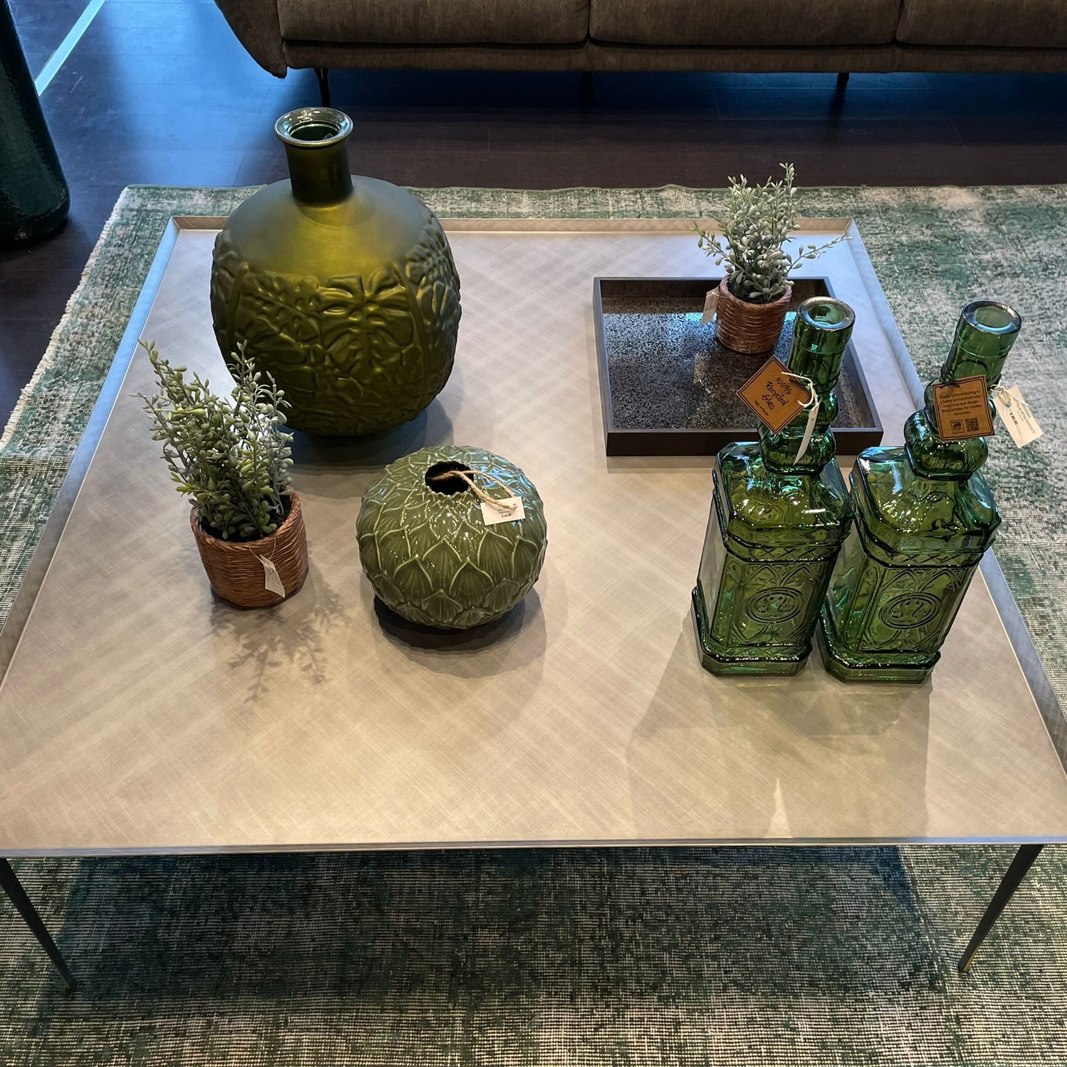Composizione in metallo bianco, dotato di due vani a giorno color salvia e due cassetti in finitura castagno rigatino nero.