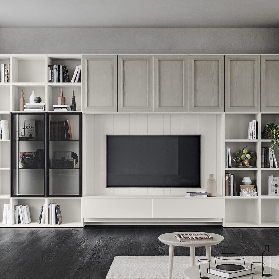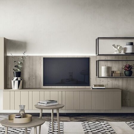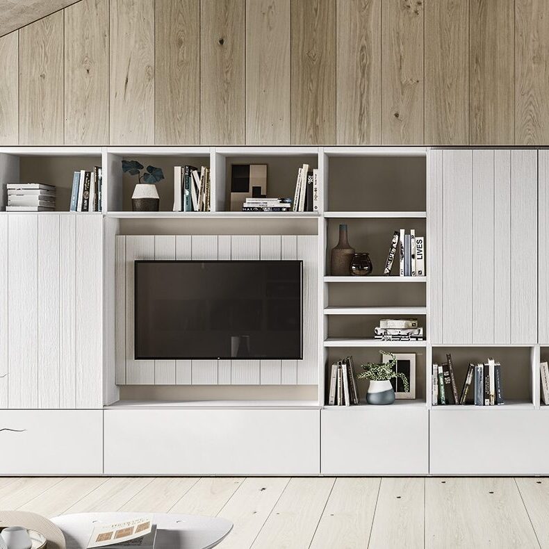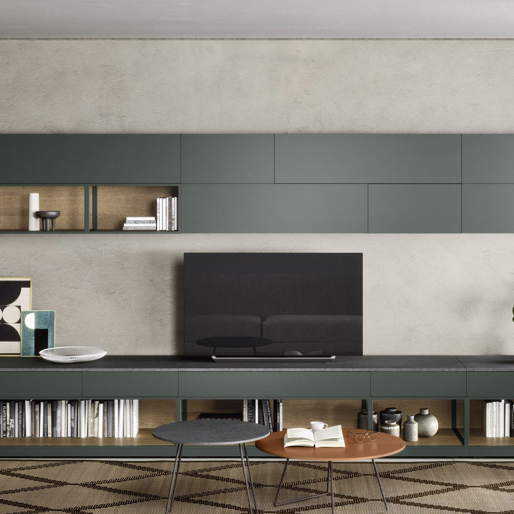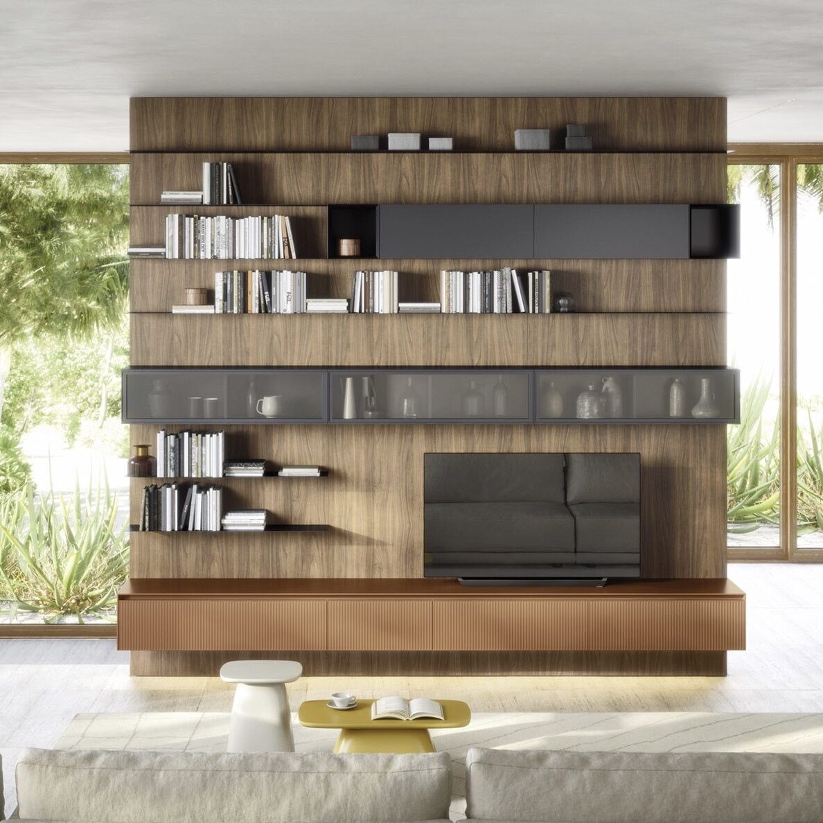 Mobile soggiorno con contenitori in legno e laccato opaco, piani e mensole in legno.