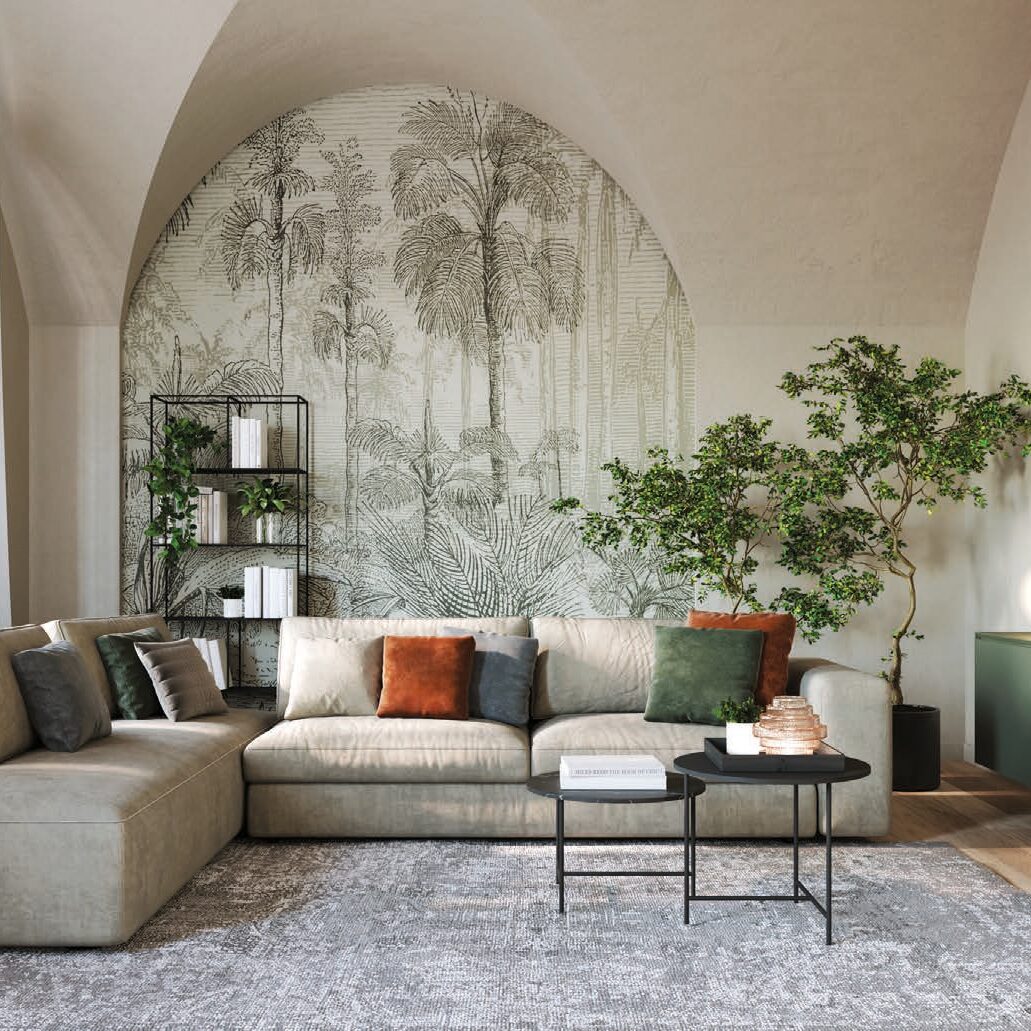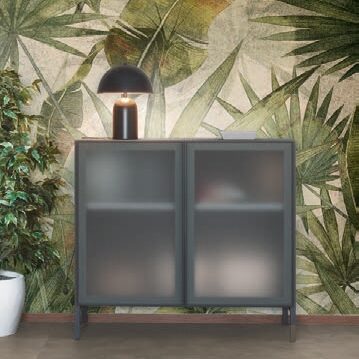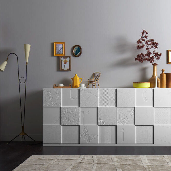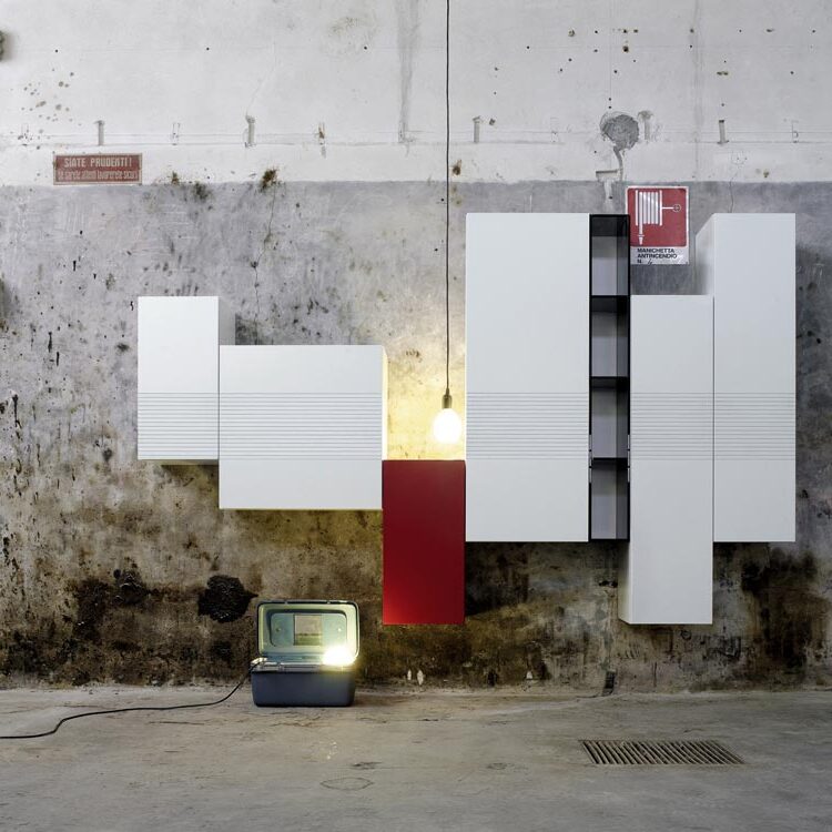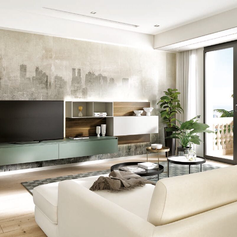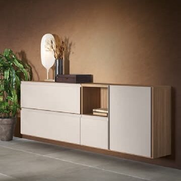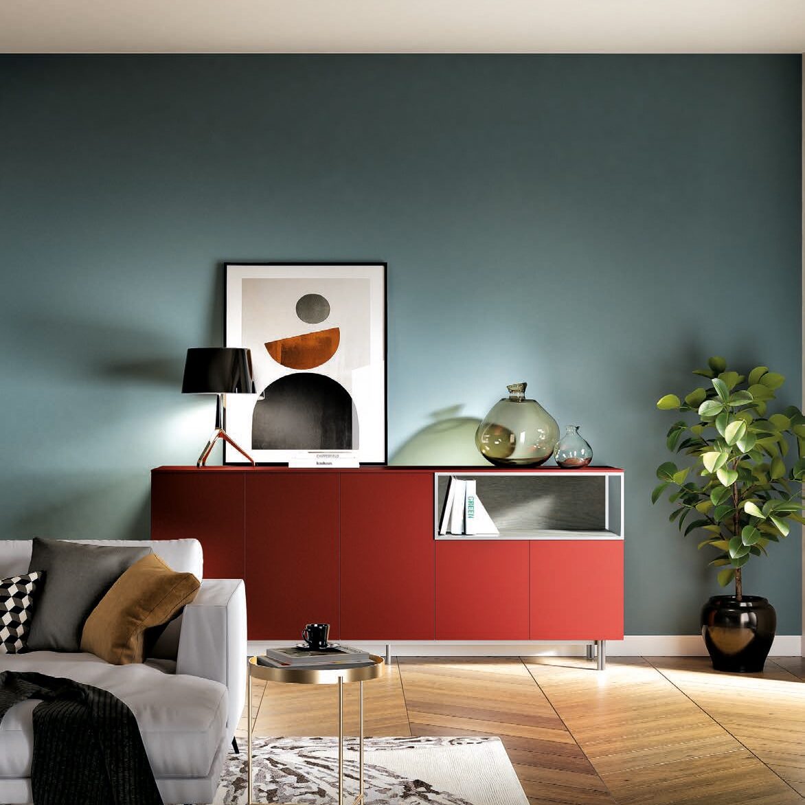 Mobile soggiorno con contenitori in legno e laccato opaco, piani e mensole in legno.