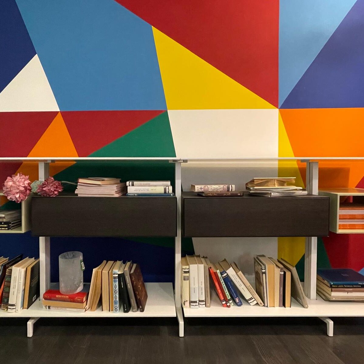 Mobile porta TV in laccato bianco lucido e base girevole in versione cromata. il suo perimetro è dotato di 7 inserti libreria.