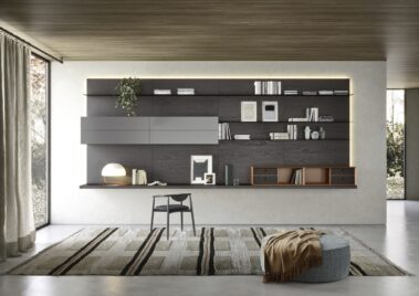 La boiserie si compone di pannelli a parete, di due diversi spessori, che possono essere attrezzati con mensole o con contenitori creando di volta in volta diversi sviluppi compositivi.