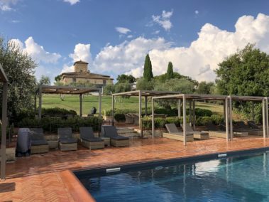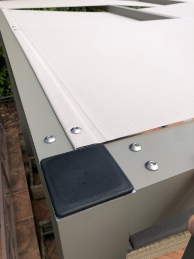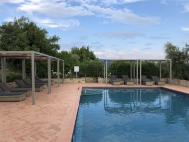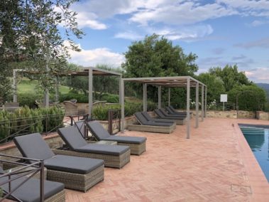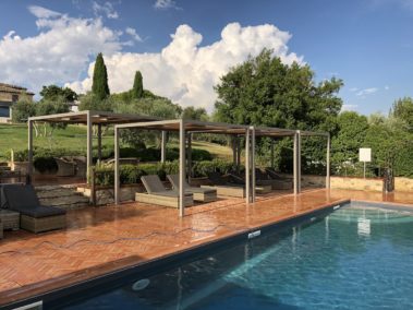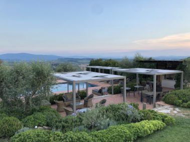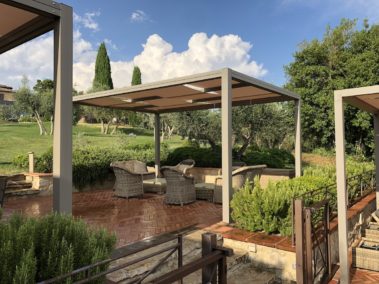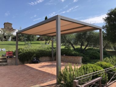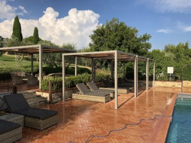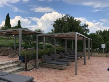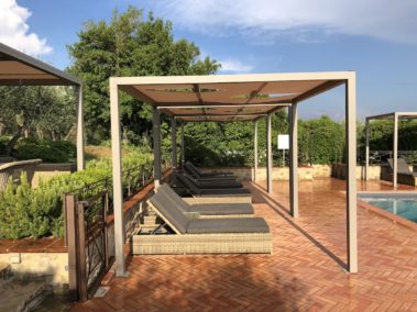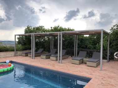 Arredo bordo piscina con strutture “Kube” in alluminio, copertura ombreggiante con telo Soltis microforato.